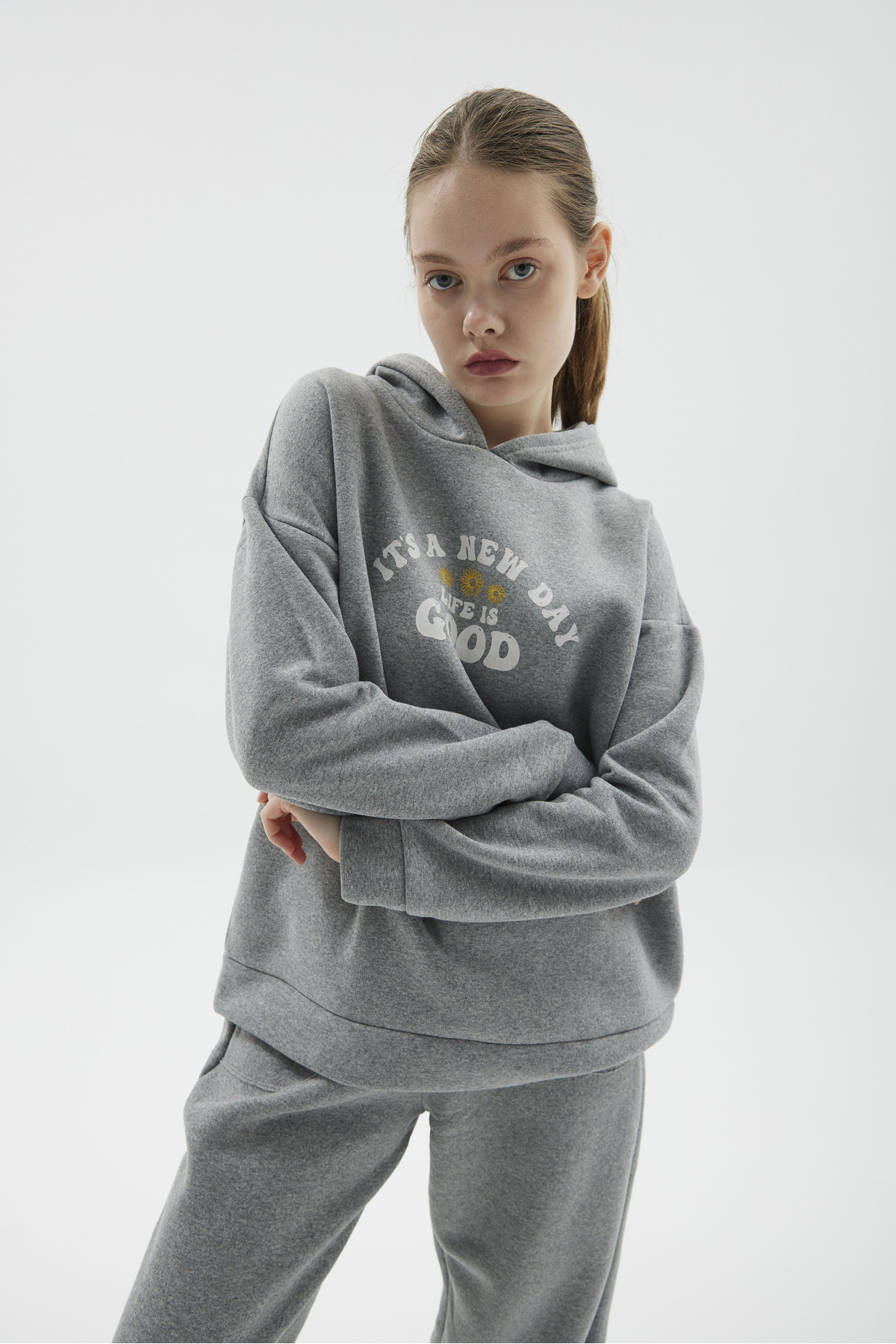 - Genç ve dinamik tarzınıza uyum sağlayacak grimelanj kapşonlu sweatshirt, günlük kullanım için idealdir.; - Relaxed kalıp sayesinde rahat bir oturuş sunar ve hareket özgürlüğü sağlar.; - Örme kumaş yapısı ile konforlu bir deneyim yaşatır ve uzun süreli kullanımlarda bile formunu korur.; - Uzun boy tasarımı ile mevsim geçişlerinde ideal koruma ve şıklık sunar.; - Grafik baskı tekniğiyle dikkat çekici slogan deseni, genç ruhunuzu yansıtır.; - Kapüşonlu yaka tipi soğuk havalarda başınızı sıcak tutarken, stilinizi de ön plana çıkarır.; - 3 iplik şardonlu dokuma tipi ile dayanıklılık ve yumuşaklık bir arada sunulur.; - Tekli paket içeriğiyle kolayca kombinleyebileceğiniz bir parça olarak gardırobunuzda yerini alır.; - Pamuk ve polyester karışımından üretilen materyal bileşeni, nefes alabilirlik ve dayanıklılık vaat eder.; - Düşük kol tipi ile modern bir siluet oluştururken, kapamasız tasarım pratik kullanım imkanı tanır.; - Günlük ortamlarda rahatlıkla tercih edebileceğiniz bu sweatshirt, 30 derecede yıkama talimatına uygun şekilde bakım yapılabilir.