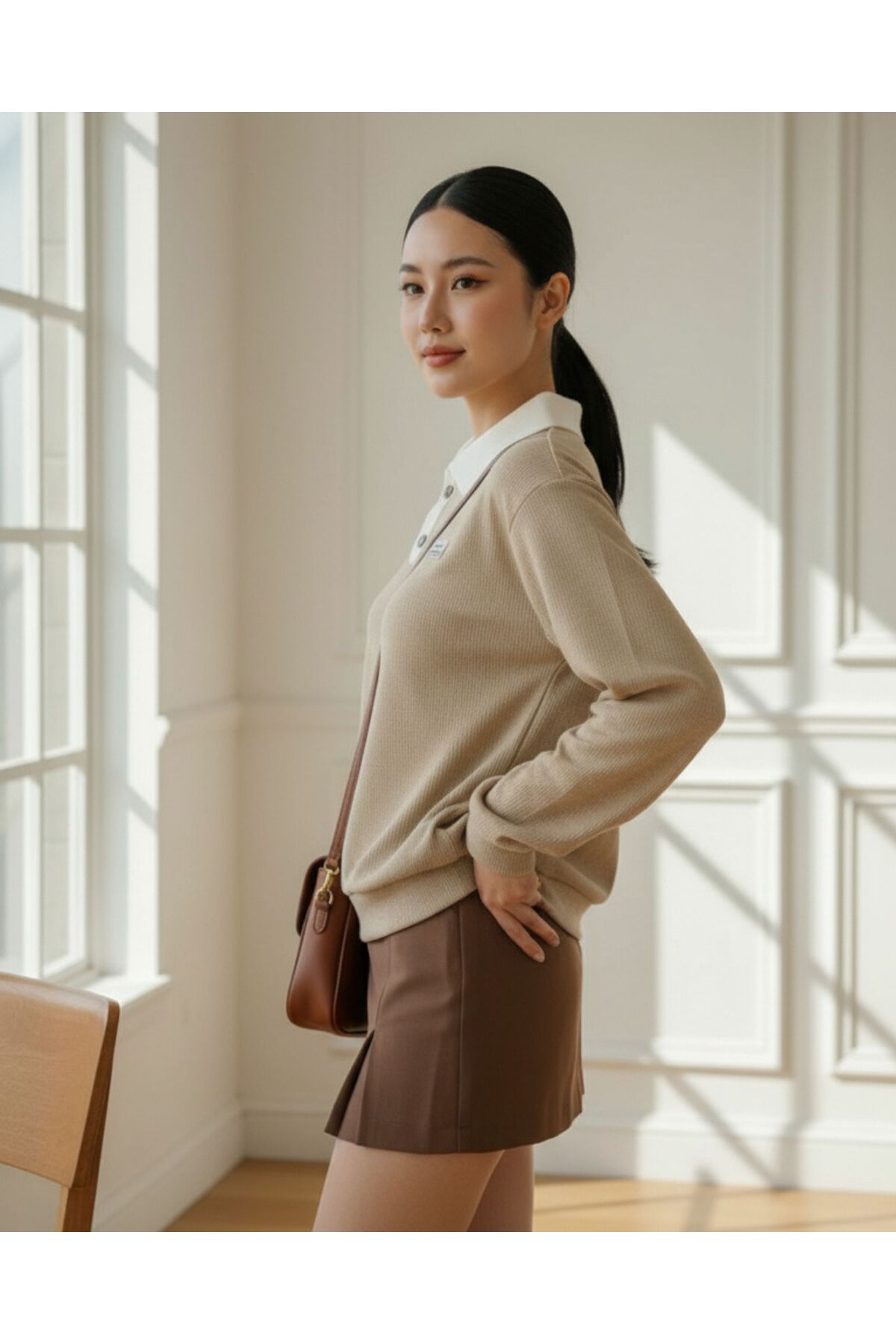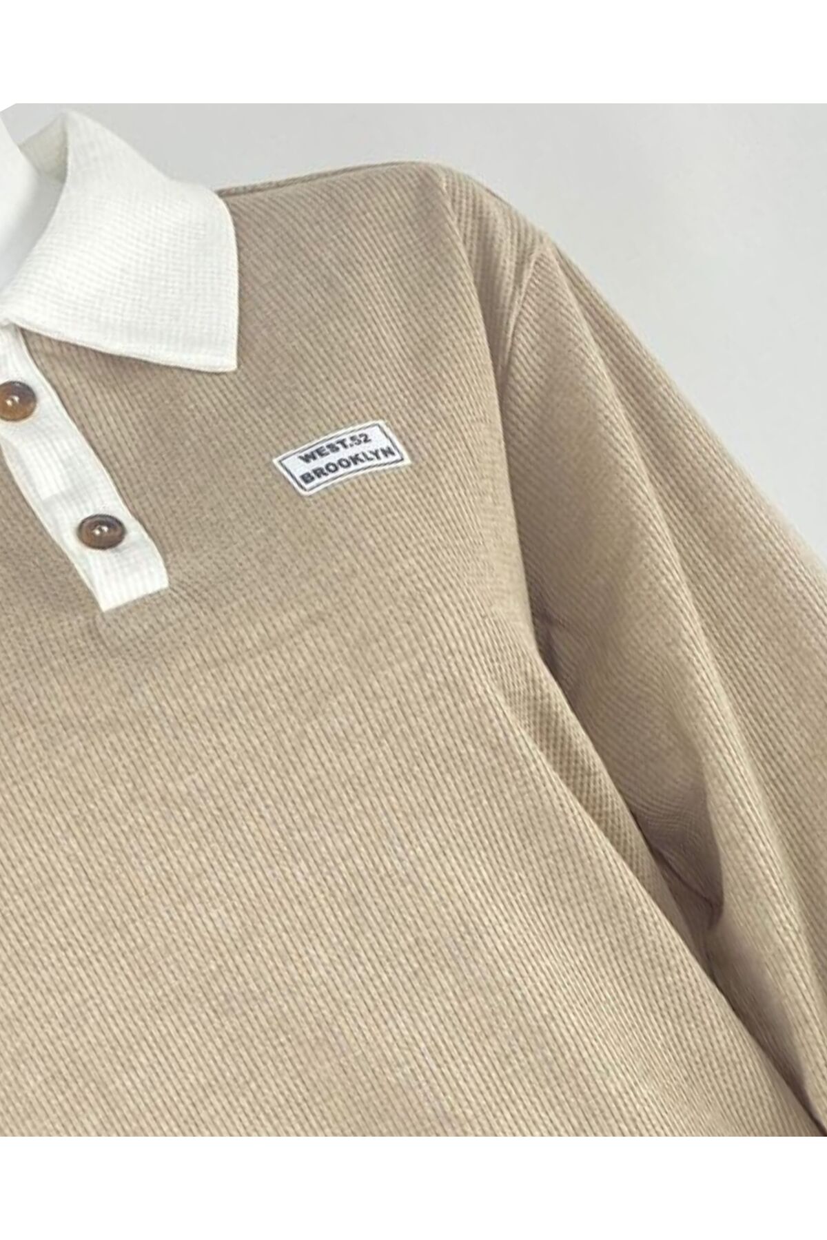 Polo Yaka Düğmeli Waffle Kumaştan Uzun Kol Tişört